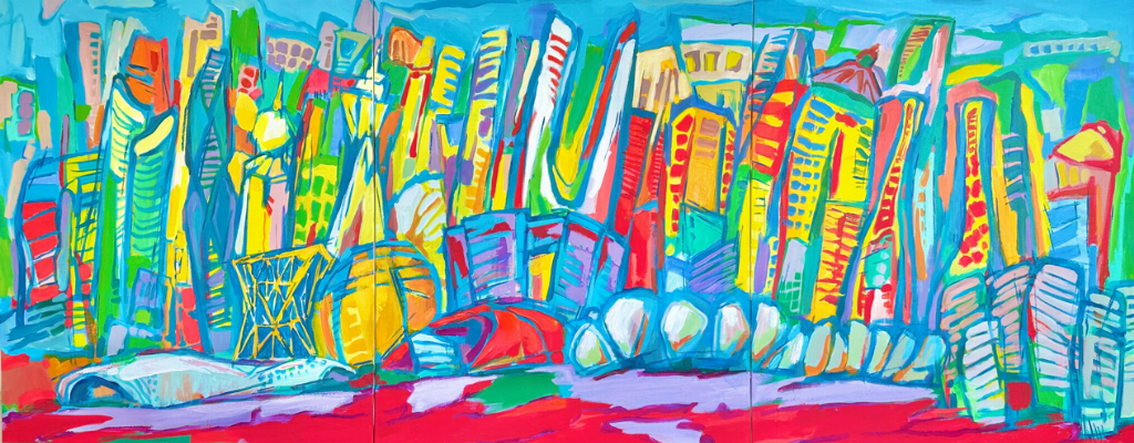 在这一视觉建构中,晨晓实现了对城市本质的现象学还原。他宣示了人们对城市的习惯性认知,那些被日常实用主义所遮蔽的城市本质得以重新展现。画布上的建筑物既是我们熟悉的都市元素,又因色彩的异质处理而变得陌生,这种“陌生化”效果迫使观者中止对城市的习惯性视而不见,重新思考城市存在的本质意义。这种艺术处理方式呼应了回到事物本身的哲学主张,通过视觉手段实现了对城市本质的准确把握。