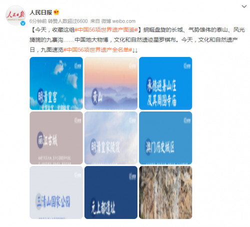 6月11日是2022年“文化和自然遗产日”。人民日报微博发布中国56项世界遗产图鉴,蜿蜒盘旋的长城、气势雄伟的泰山、风光旖旎的九寨沟……中国地大物博,文化和自然遗迹星罗棋布。